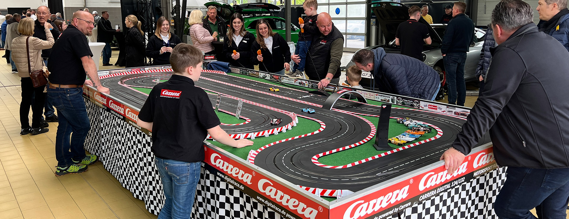 Damit die Gäste in aller Ruhe unsere Highlights entdecken konnten, stand für den Porsche Nachwuchs eine Carrerabahn bereit, auf der die kleinen und größeren Kids schon einmal ihre fahrerischen Qualitäten unter Beweis stellen konnten.